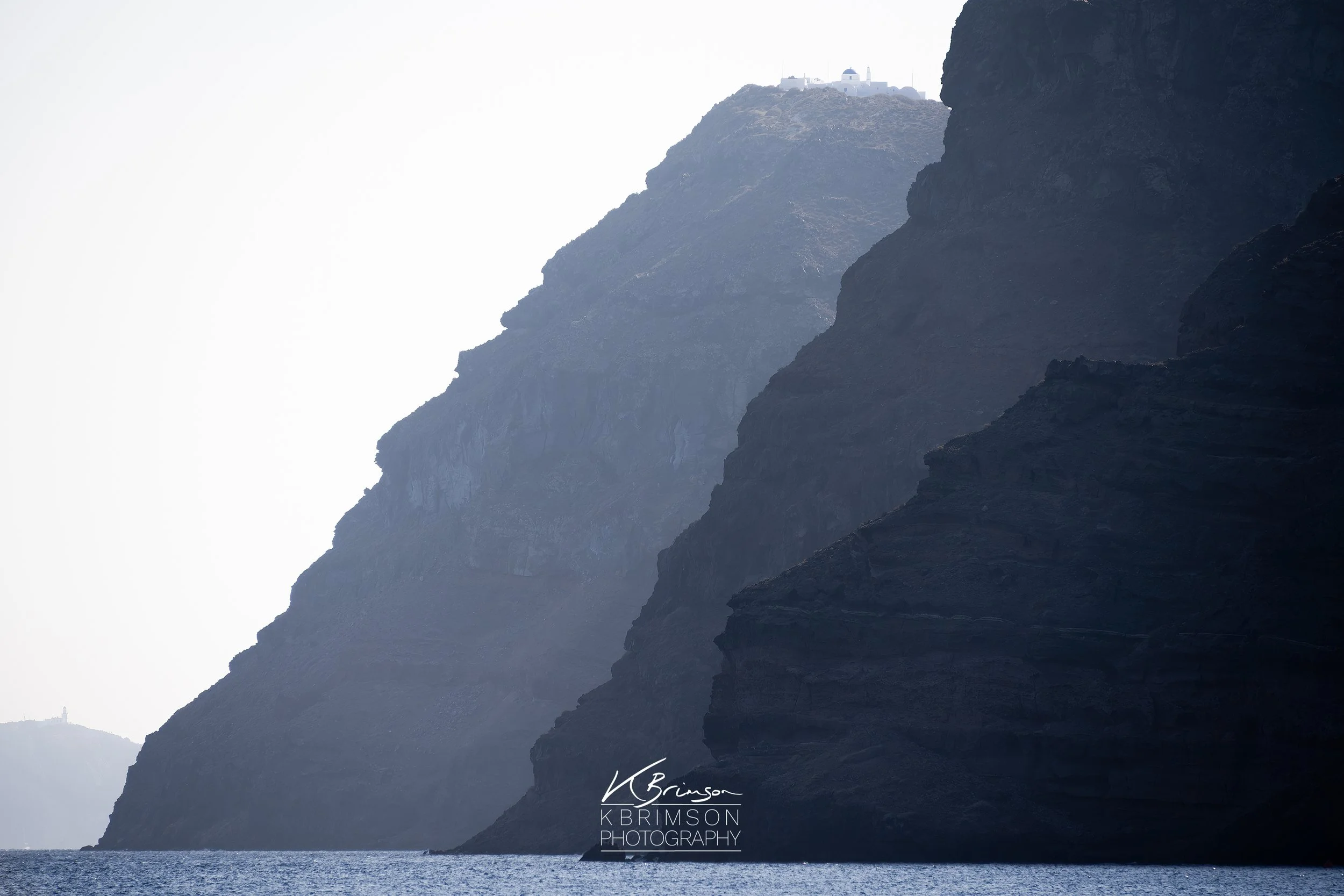 That said, the atmosphere and drama created by the island’s volcanic slopes were really apparent in the natural features around the port. Nestled at the foot of steep and rugged cliffs, the port enjoyed a cocoon-like effect and really gave a sense of scale to the island’s volcanic architecture. In this image, I particularly like the way that the midday haze creates a striking, staggered shading effect, beautifully contrasting the forms of the cliffs as they jut out into the sea. The blue tones create a really magical quality, while clearly separating each face and encouraging you to really absorb the setting. The crowning features are the glimpses of Iera Moni Kimisis Theotokou (Monastery of the Dormition of the Virgin Mary) built in 1851, and Akrotiri Lighthouse built in 1892 beyond, both of which are dwarfed by the gargantuan cliffs.